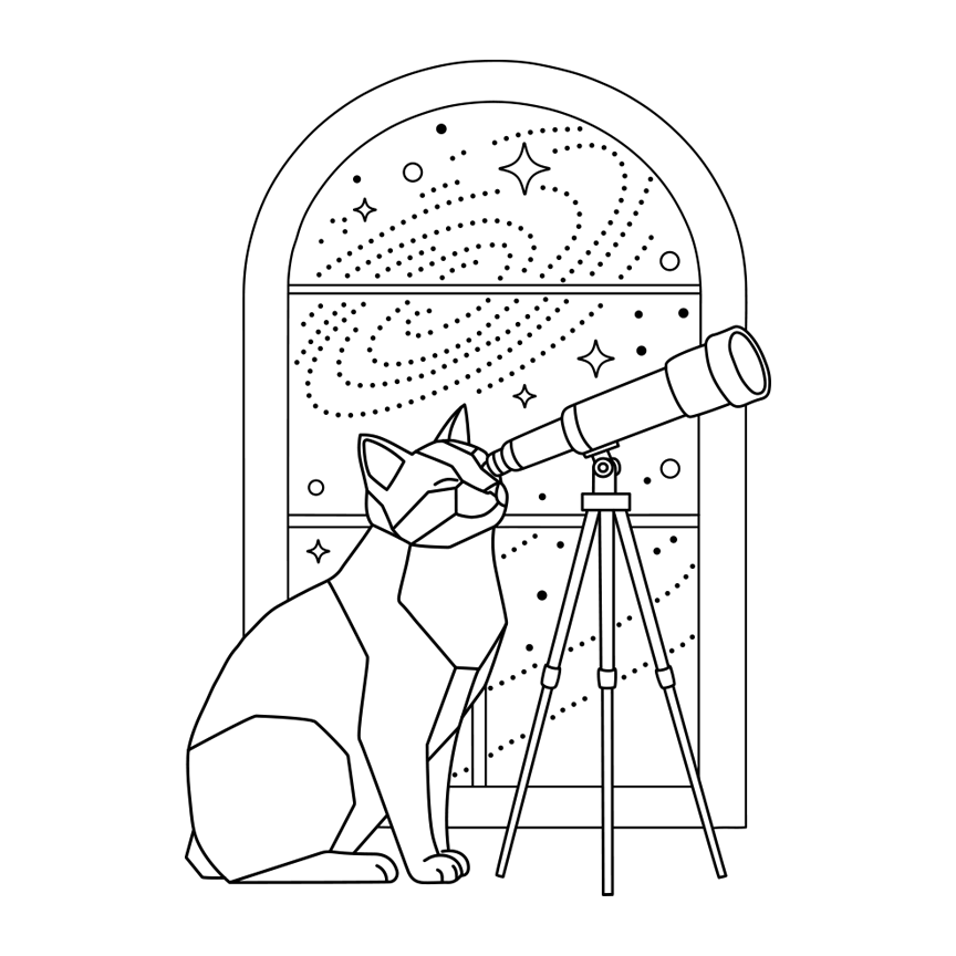 Discover the universe through the eyes of our enchanting "Cosmo Scope Cat." This whimsical black-and-white digital printable captures a curious cat at a telescope, inviting serene contemplation and cosmic wonder into your space.